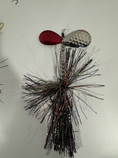 8/9 COMBO BLADE BLACK RAINBOW SKIRT WITH 9 NICKEL HEX BLADE WITH 8 TRANS RED BLADE. LURE COMES WITH TUBE BEAD FOR DIFFERENT VIBRATION
